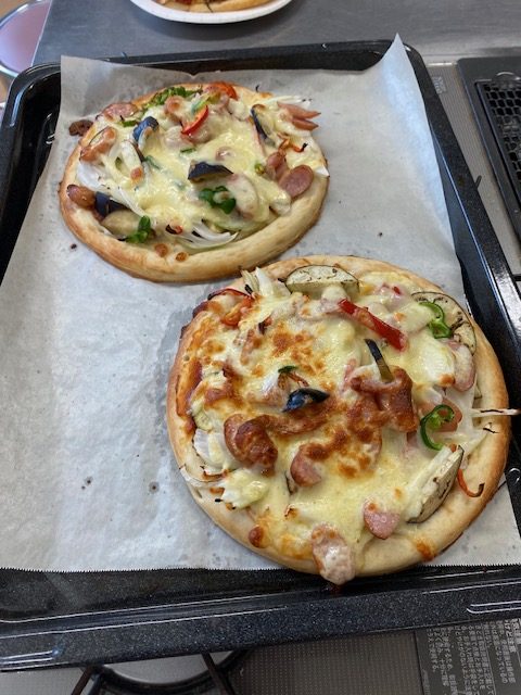 トッピングの具材は、トマト、ピーマン、茄子、ソーセージ、シラス、海苔、きざみネギ等などでした。夏休み中なので、子どもも3人参加して賑やかに楽しく調理が進みました。野菜が新鮮だったこともあり、焼き上がったピザはどれも極上の味に仕上がって、参加者全員大満足のカフェになったのではないでしょうか。