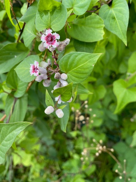 この「ヘクソカズラ」は、里山で普通に見られる植物ですが、葉を揉むと悪臭がすることから名付けられたようです。ネットを見ていたら、命名者は牧野富太郎博士だという説と、そうではなく名付け親は不明だという説の両方が出ていて、結局どちらか分かりません。いずれにしろ、おしゃれな色と形で目を引く花であることは間違いありません。花言葉は、「人嫌い」「誤解を解きたい」「意外性のある」だそうです。
