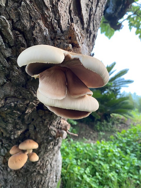 オレンジの入り口近くの木に、食べられそうなキノコが生えているのを見つけたので、写真を撮ってきて鑑定してみました。木から生えて色が薄いグレー、そしてこの形状からすると、食菌だったら「ブナシメジ」。毒キノコの「ツキヨタケ」ならば、もう少し色が茶系で群生しているはずです。ブナシメジは「ホンシメジ」の名前で市場に出回っているキノコなので試食してみたいところですが、今ひとつ確信が持てないので、今回は食べるのは見送ることにしました。