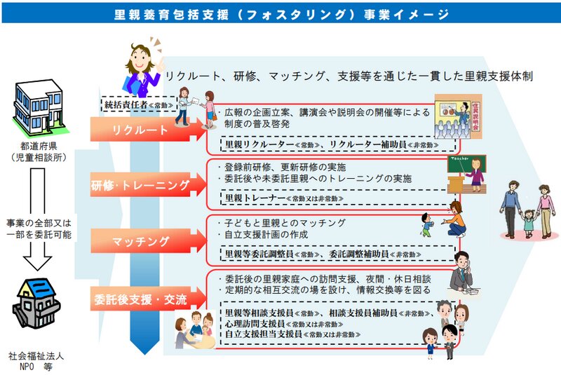 現在、国が里親支援をする機関として位置づけているのは、児童相談所、里親支援専門相談員(里専)を配置している施設、児童家庭支援センター(児家セン)、里親支援を目的としたNPO法人などです。全国的に見てみると、里親支援体制にはそれぞれの自治体ごとに特徴があり、様々な形態があります。児童相談所がほぼすべての支援業務を担っているところ、児童養護施設や児家センがフォスタリング機関となって包括的支援を行っているところ、また研修事業、訪問相談事業、普及啓発事業、リクルート事業などを、それぞれ別な機関が担っているところなど、自治体ごとに違っています。