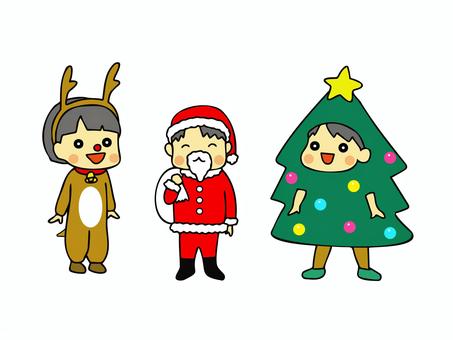 二月ほど前、東上総支部里親会「はまゆう会」の事務局を担当している里親支援専門相談員のSさんから、12月10日の日曜日に開催されるクリスマス・イベントで何かやってくれと頼まれました。本来ならオレンジ・バンドの出番ですが、参加人数がはっきりしないのと、会場のスペースからフルメンバーをそろえる規模ではないと考え、最近まで私がギターを弾いてバンドのマネージャーと二人で歌うことにしていました。しかし、ここに来て参加者が30人近くになってきたことを知り、急遽サックス担当のメンバーを加えた上、クリスマス・イベント用の着ぐるみを着ることにしました。下のイラストのようなイメージですが、実際はマネージャーが「もみの木」、サックス担当が「スノーマン」、私が「トナカイ」になります。