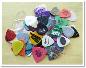 ギター・ピックは、下の画像のように材質、色、形状、大きさが千差万別なので、同じものを別々な演奏者が使っていることはまれだと思っていました。