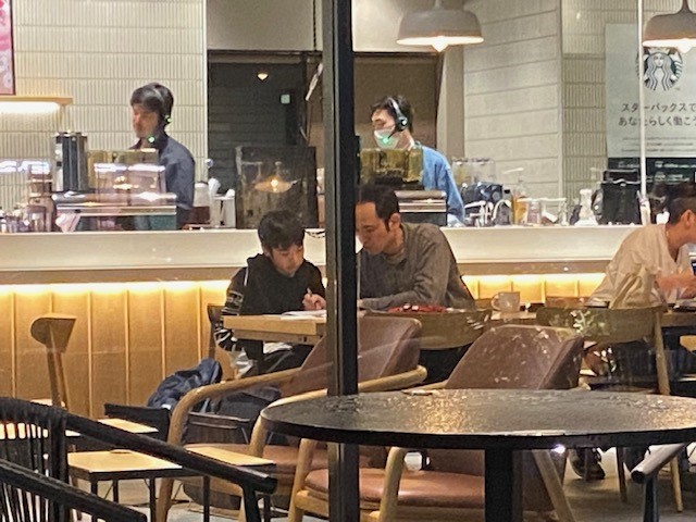 前にも少しお話ししましたが、学習塾で講師とうちの子がマンツーマンの日には、スタバを利用することがあります。少し音があった方が集中できるようで、つい最近も二人で入って2時間ほどたってから迎えに行ったときも、画像のようにしっかりと勉強していました。