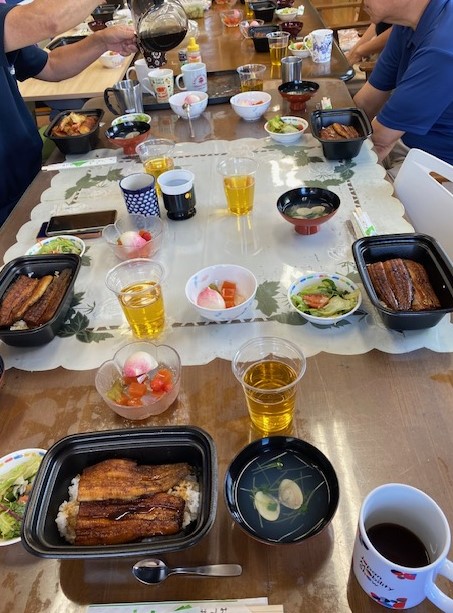 南オレンジでは月に一度の会議日に合わせて、スタッフ全員が集まって昼食をとることにしていて、先日は少し贅沢をして鰻を食べました。地域で評判のうなぎ屋さんから白焼きを買ってきて、オレンジの台所でたれをつけて焼いて「うな丼」にしました。ちょっと量は少なめでしたが、もう少し食べたかったと思うくらいの方が良いかな。