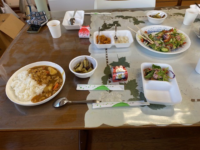 昨日は今年初めての「オ・ランチ」で、お昼のメニューは、カレーとサラダと菜花のおひたしとデザートに細い大学芋みたいなスイーツでした。カレーは柔らかく煮込んだじゃがいもと人参がゴロゴロと入っていてとても美味しかったです。調理してくれたスタッフによると、隠し味に桃のネクターと福神漬けの汁を入れたので、より一層まろやかな味に仕上がったそうです。