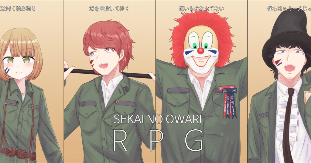 『空は青く澄み渡り 海を目指して歩く 怖いものなんてない 僕らはもう一人じゃない 大切ななにかが壊れたあの夜に ぼくは星を探して一人で歩いていた ~以下略~ 』(「RPG」SEKAI NO OWARI)