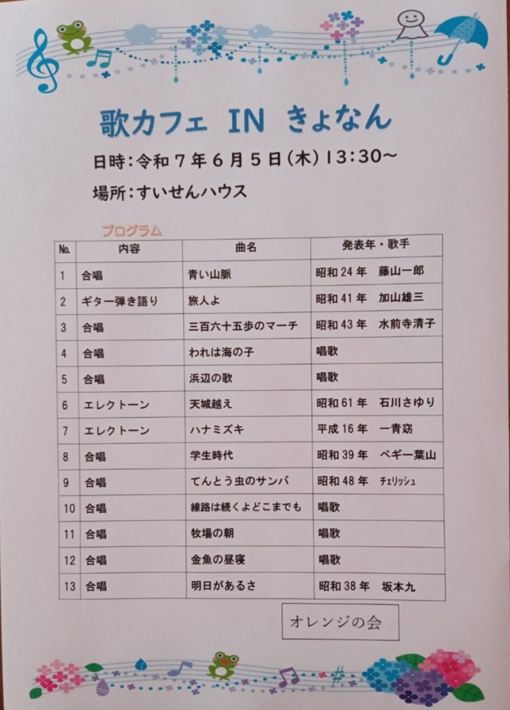 明日は午後1時半から鋸南町高齢者カフェがあります。演奏する曲目は、下のプログラムの予定でしたが、先日この欄でお伝えしたように5番目の「浜辺の歌」を季節に合わせて「夏は来ぬ」に変更しようと考えています。また、どこかのタイミングで、これも季節の歌の「びわ」を入れたいと考えています。