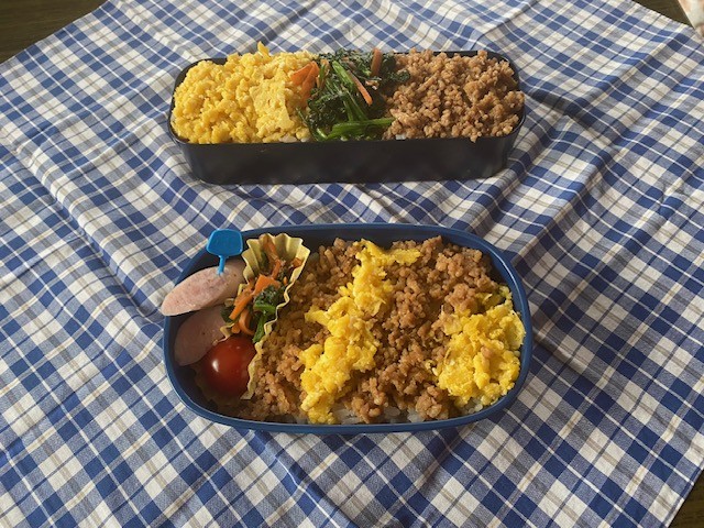 一昨日の私と高1の里子のお弁当を並べてみました。写真の上の方は私ので、ひき肉とタマゴのそぼろと、ほうれん草・人参のソテーの三食弁当。子どものはそれに少しアレンジを加えています。私はいやしくご飯とおかずを目いっぱい詰めたので、容器からあふれそうになっています。