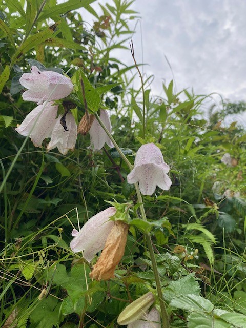 一昨日の続きで、曇り空の下のウォーキング中に見た植物のことです。ユキノシタの花の近くにホタルブクロの花を見つけました。この二つは、同じような環境で同じような時期に花を咲かせる植物のようです。ちょっとした違いがあるとすれば、ホタルブクロは藪の中でも花を咲かすことができることでしょうか。