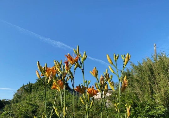 数年前、田んぼのあぜ道に大量に発生していたノカンゾウを数株採ってきて庭の片隅に植えました。すごい生命力と繁殖力で他の植物を圧迫するので、家の近くの荒れ地に移植したところ昨年ころから立派な花をたくさんつけるようになりました。今年も竹林と青空をバックに鮮やかなオレンジの塊(かたまり)が映えています。
