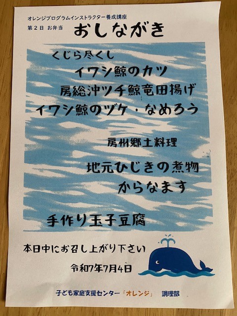 一昨日と昨日の二日間、南オレンジを会場としておこなわれた研修で、調理スタッフが手作りのお弁当を受講者から希望をとって(受講者22名全員希望されました)格安で提供しました。とびきり評判の良かったお弁当には、素敵な「おしながき」も添えられました。