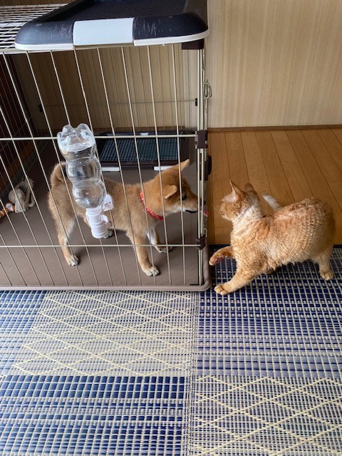 下の画像でナッちゃんはケージの中にいますが、ケージから出した後も二匹はしばらくじゃれあって遊んでいました。