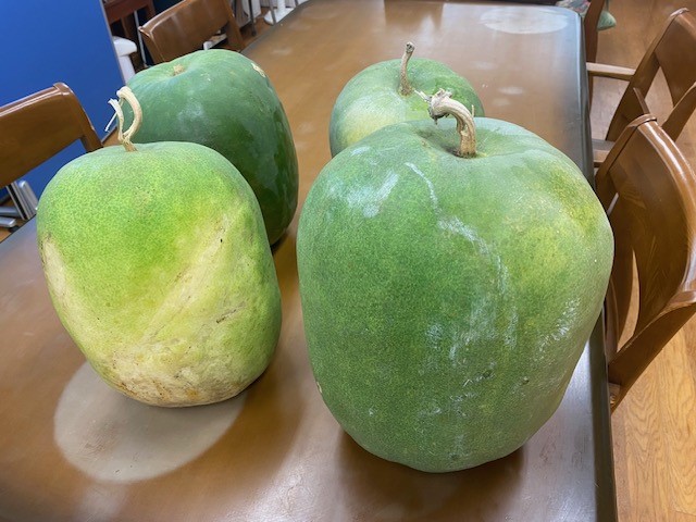 一昨日の日曜日、千葉明徳短大で更新研修がありました。このような研修の際、オレンジでは、南オレンジ・K’orange・Sakuraから幾人かずつ必要な人数の職員を派遣して運営に当たります。一昨日はSakuraの職員から大きな冬瓜(とうがん)を4つ、南オレンジにといただきました。昨日、南オレンジでは、持ち帰った冬瓜の重さや食べ方、また、くれた職員が作った物なのかなどの話題でひとしきり盛り上がりました。