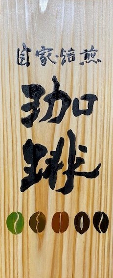 まず、ホームセンターで板を買ってきて、それにお手本の字を書き写して、下にコヒー豆の絵を描いてみました。それが乾くのを待って、上からニスを3度塗りしたあと、板を適当な長さにカットして完成しました。板の購入からカットが終わるまで、6時間ほどの作業でした。