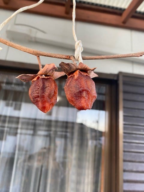 干し柿の様子が気になって毎日観察しています。しぼみ具合や表面のつやの変化をみたり、指でつまんで弾力を確かめたりもしています。軒下に吊してから3週間がたちますが、冷え込む日が続きなおかつ雨が少ない、素人考えですが干し柿作りには最適な環境だったのではないでしょうか。