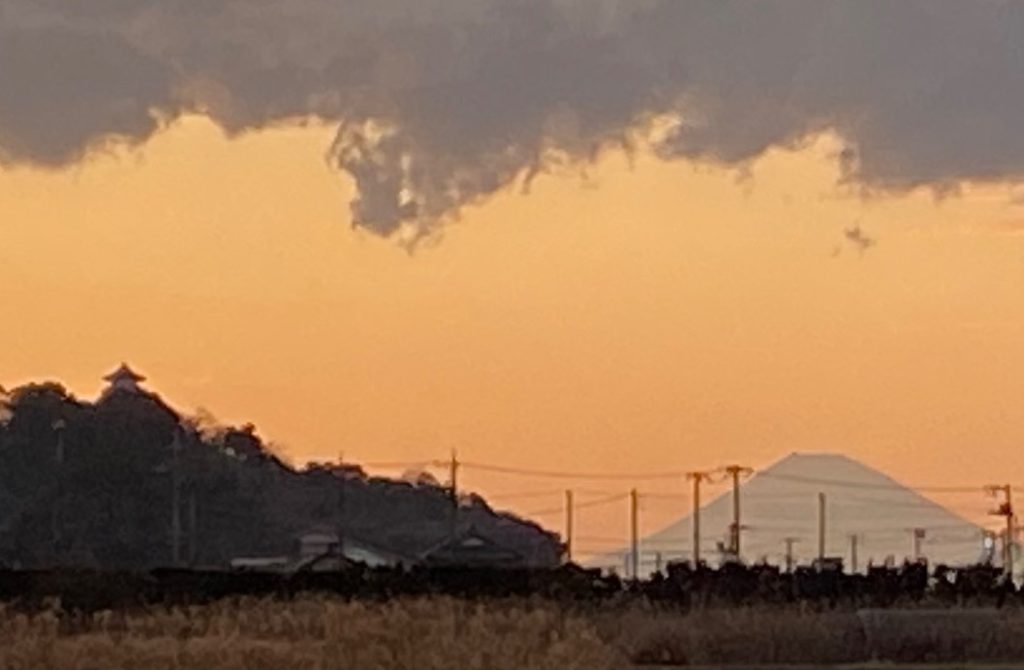 この時期、定時に退勤すると、夕焼けの中、館山城と富士山のシルエットがセットになって見えるポイントがあります。それも、電柱・電線がいい感じで富士の完璧さを邪魔しています。しかし、天気や時間の関係もあり、なかなか思うような画像が撮れずにいます。今回も車を停めて歩いて撮影ポジションを探しているうちに、鮮やかな夕焼けは他の空に移っていってしまいました。この写真はこれで気に入っていますが、いつか真っ赤に染まった空をバックに、黒々とした城と富士を撮りたいと思っています。