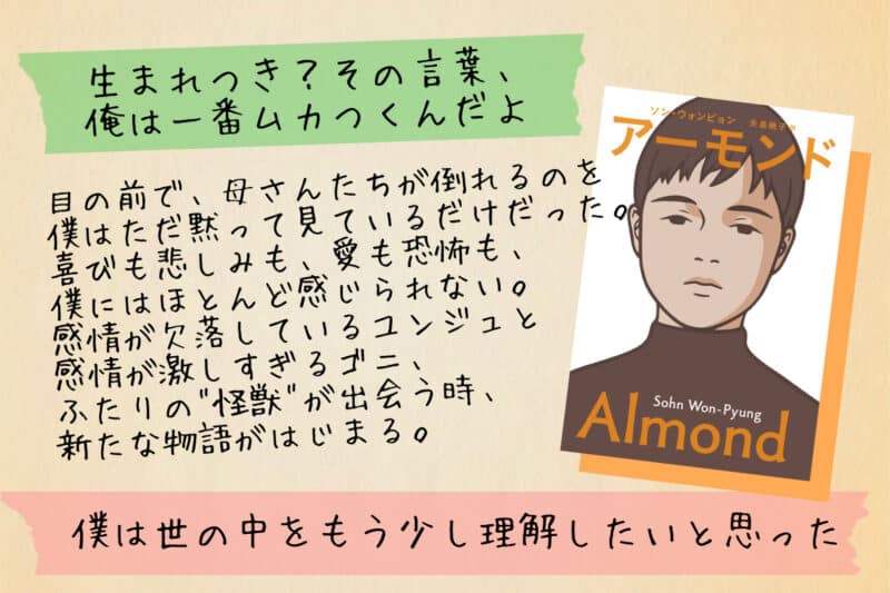 図書館の窓口で、今、中1の里子の読んでいるシリーズものを借りる手続きをしていたら、カウンターにこの本が置いてありました。見覚えのある本だったので、借りられるか聞いたところ、「返却されたところだから貸し出し可能ですよ。」と言われ借りてきました。「扁桃体(アーモンド)が人より小さく、怒りや恐怖を感じることができない十六歳の高校生、ユンジェ。そんな彼は、十五歳の誕生日に、目の前で祖母と母が通り魔に襲われたときも、ただ黙ってその光景を見つめているだけだった。そんなとき現れたのが、もう一人の”怪物”、ゴニだった。激しい感情を持つその少年との出会いは、ユンジェの人生を大きく変えていく──。」見たことのある表紙だと思ったのは、どこかで2020年の本屋大賞翻訳小説部門第1位の本と紹介されていたからだと思います。子どもも「この本知ってる」と反応していましたが、私がこの土日の出張に持って行って、先に読もうと思います。