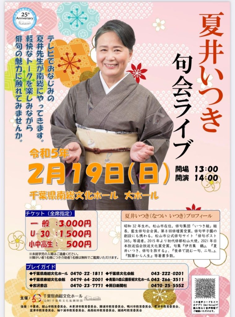 南総文化ホールで開催された「夏井いつきの句会ライブ」というイベントに行ってきました。中1の里子と一緒に行く予定で、二人分のチケットを買ってあったのですが、当日の朝、やっぱりスケボーに行きたいというので、急遽知人に連絡して行ってもらうことになりました。
