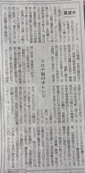 昨日の日曜日、南房総地域の地方紙「房日新聞」の一面コラム「展望台」では、「コロナ禍のオレンジ」と題して、「オレンジは、NPO法人・子ども家庭サポートセンターちば「オレンジの会」が設置運営する子ども家庭支援センター「オレンジ」のこと。」から始まり、オレンジの活動が丁寧に紹介されていました。オレンジが行っている学習会、弁当宅配、リズムとお話しの森、子ども食堂、ペアレントトレーニング等などが細かく説明されていてありがたく思いました。コラムは、「「コロナ禍にこそ気負い無き伴奏者たれ」、オレンジはつぶやく。」と結ばれていました。